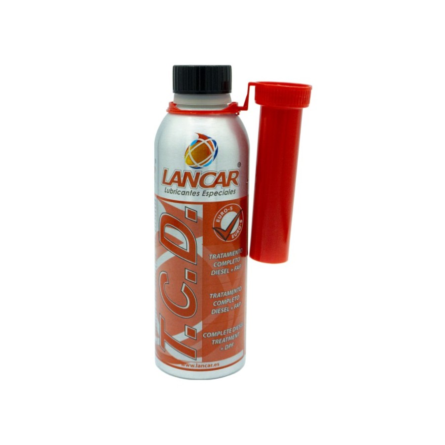 Lancar T.C.D. es uno de los tratamientos diésel más completos y avanzados del mercado, especialmente formulado para su utilización en vehículos diésel EURO-5, EURO-6 y siguientes. Solventa todas las deficiencias de los gasóleos y motores diésel modernos. Combina aditivos detergentes de última generación (cumple los test de motores DW-10 y XUD-9), lubricantes con tecnología “0 SAPS”, mejoradores de eficiencia y regeneradores del filtro de partículas. Gracias a la combinación de detergentes y aditivos catalizadores limpia y protege todo el sistema, desde el depósito hasta la línea de escape (inyectores, cámara de combustión, DPF/FAP...).