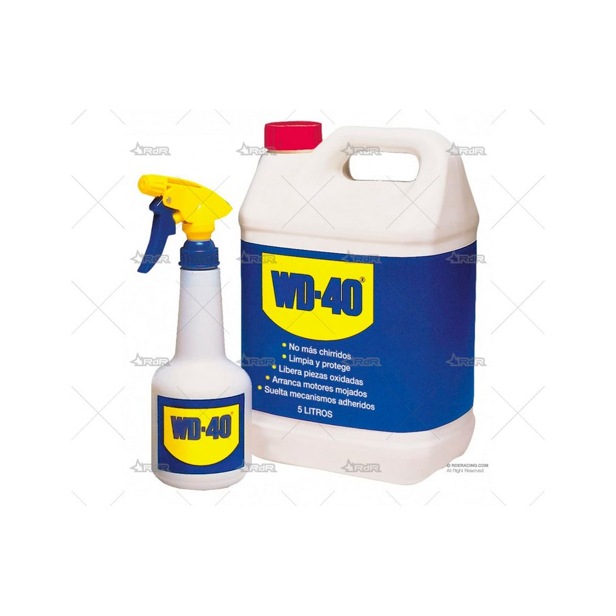 WD-40 Producto Multi-Uso en garrafa de 5L acompañada de un pulverizador. Ofrece una solución versátil para el mantenimiento y protección de piezas y superficies metálicas. Lubrica piezas como bisagras, rodamientos, cadenas y engranajes, asegurando un funcionamiento óptimo. Además, abrillanta y limpia cromados, eliminando suciedad, adhesivos y restos de pintura para un acabado impecable. Su fórmula desplaza la humedad de cuadros eléctricos, bujías y componentes eléctricos, previniendo fallos y garantizando un mejor rendimiento. También afloja piezas atascadas o corroídas como tuercas, candados y pistones, facilitando su desmontaje. Por último, protege contra el óxido y la corrosión, alargando la vida útil de herramientas y maquinaria.