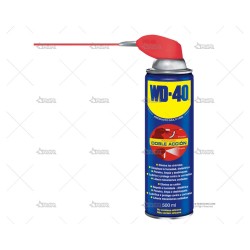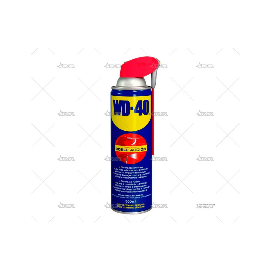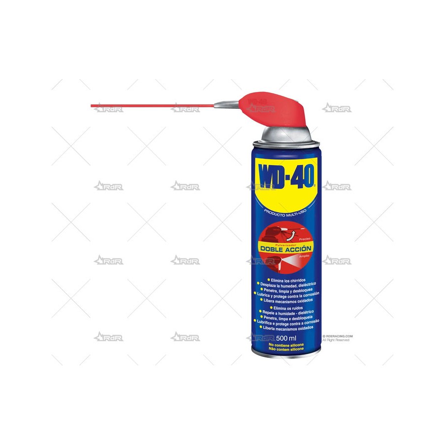 WD-40 Multi-Uso Doble Acción de 0,5L. Lubrica piezas en movimiento como bisagras, rodamientos, cadenas y engranajes. Abrillanta y limpia cromados y cualquier superficie metálica, eliminando también adhesivos, grasa, suciedad y restos de pintura. Desplaza la humedad de cuadros eléctricos, bujías y cualquier conexión eléctrica. Afloja, penetra y libera piezas atascadas y oxidadas como tuercas, candados y pistones.