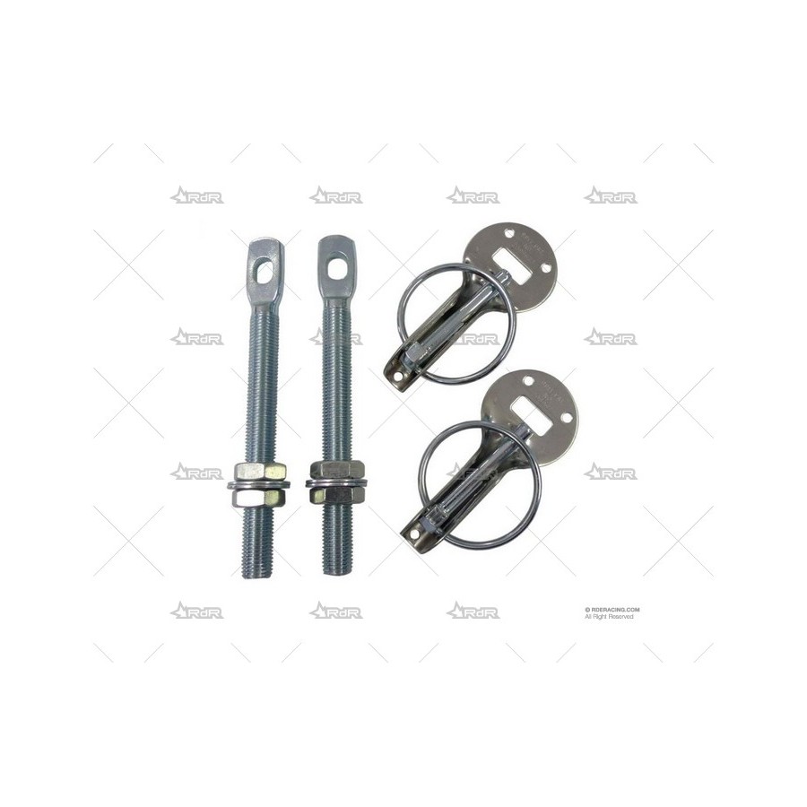 Pareja de cierres de capó tipo Dakar, fabricados en acero inoxidable, incluye vástagos de fijación de acero galvanizado con sus tuercas y arandelas, también incluye tornillos y tuercas de chapa para su sujeción.