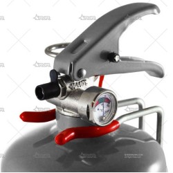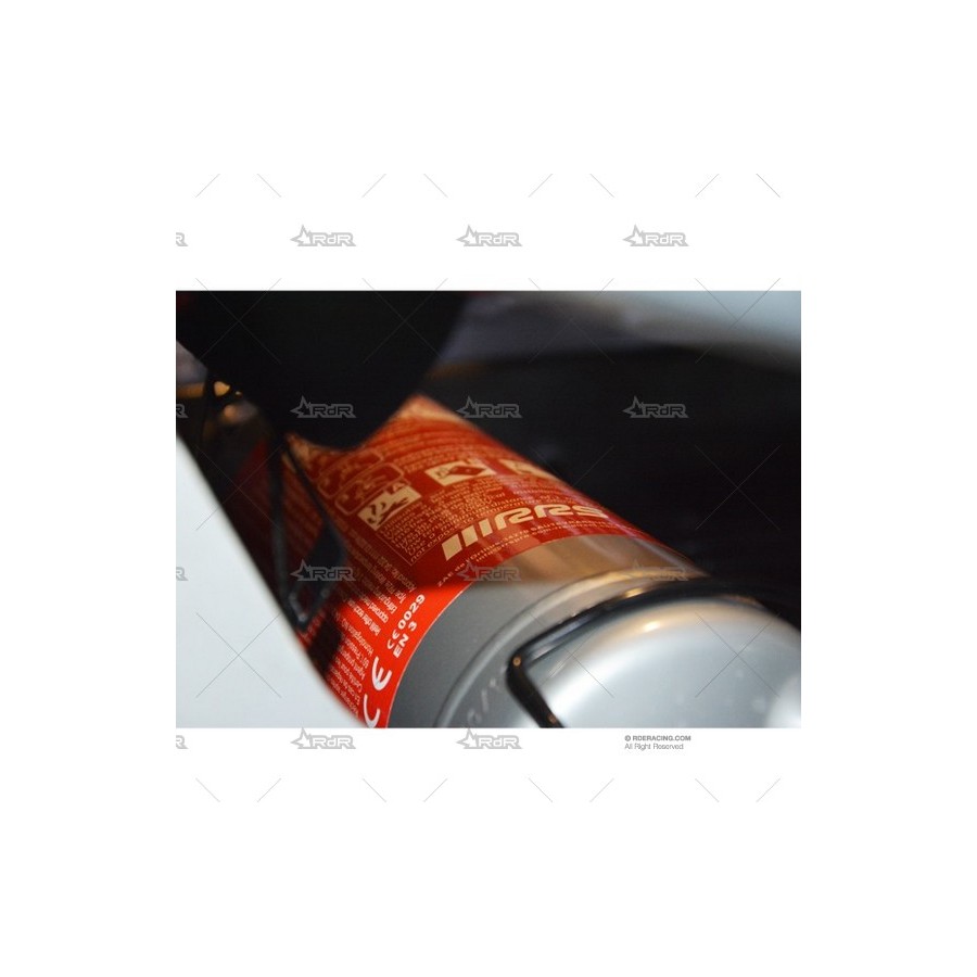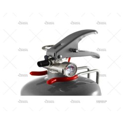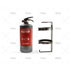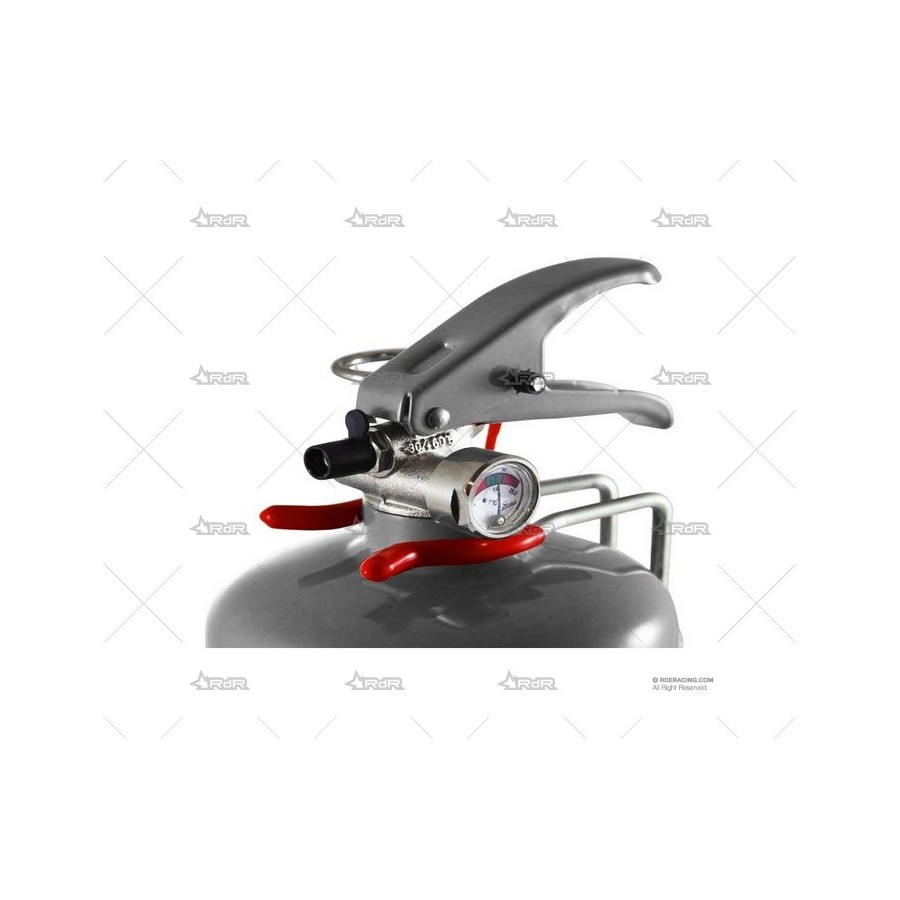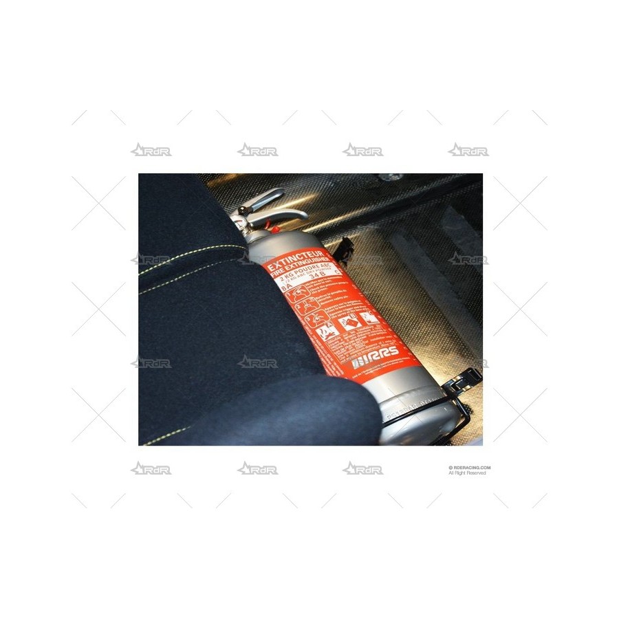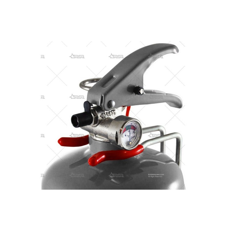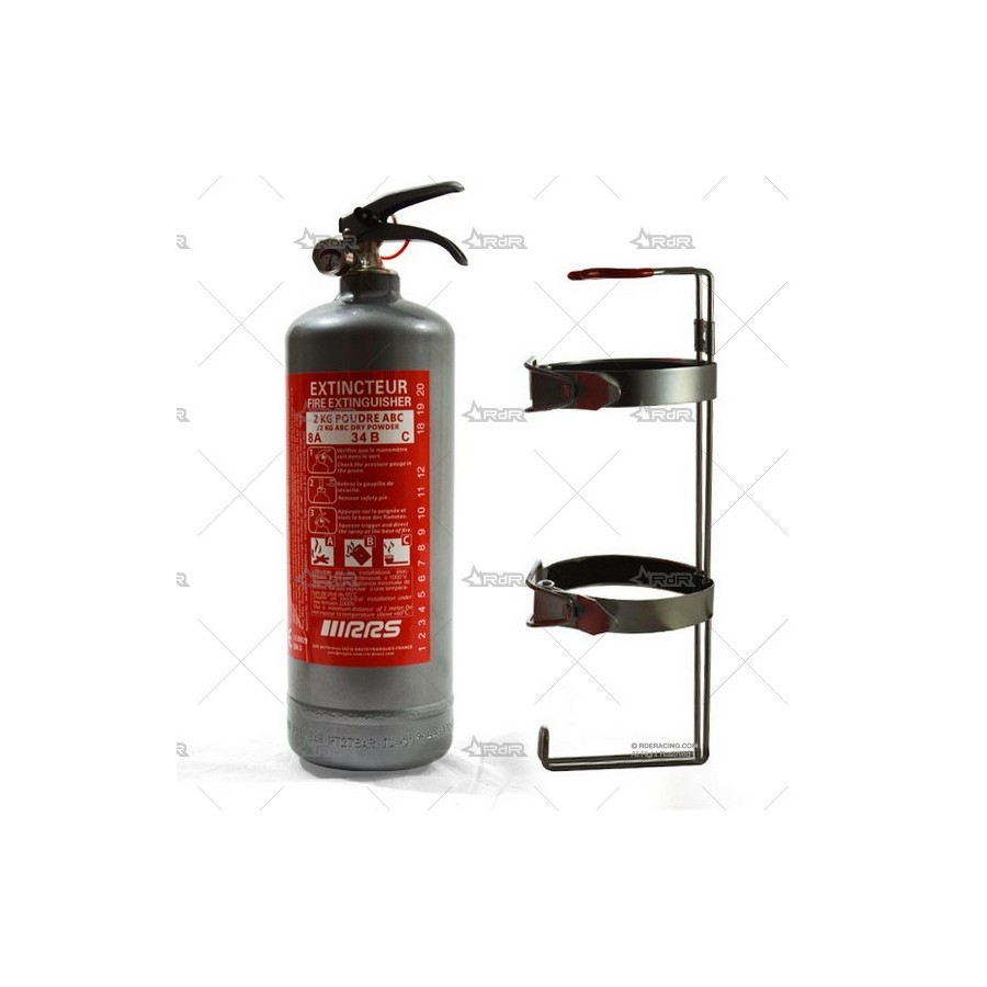 Extintor de mano económico de la marca RRS con botella color gris fabricada en acero, se entrega con soporte homologado FIA. Extintor con 2kg de POLVO ABC-EN3. Con homologación FIA-EN3.