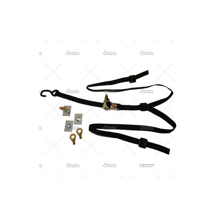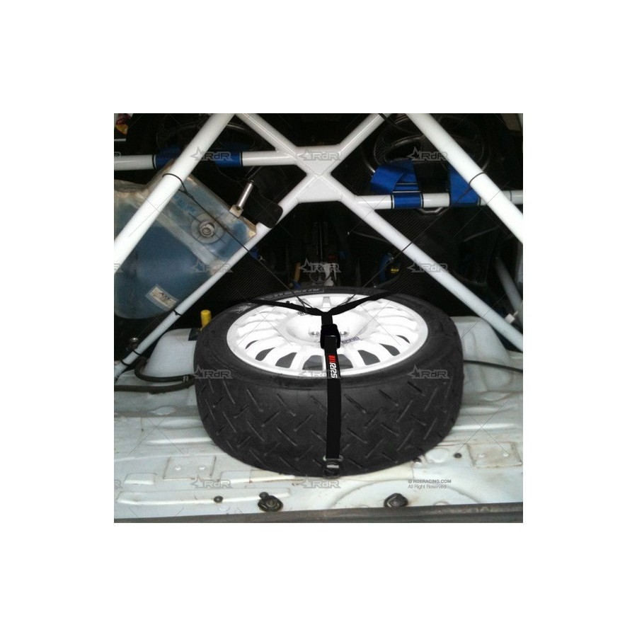 Correa para rueda de repuesto con trinquete RRS. Fijación rápida y duradera de la rueda a la parte trasera del vehículo. Apriete con trinquete. Incluye 3 placas de fijación y 3 ojales para atornillar a las placas.