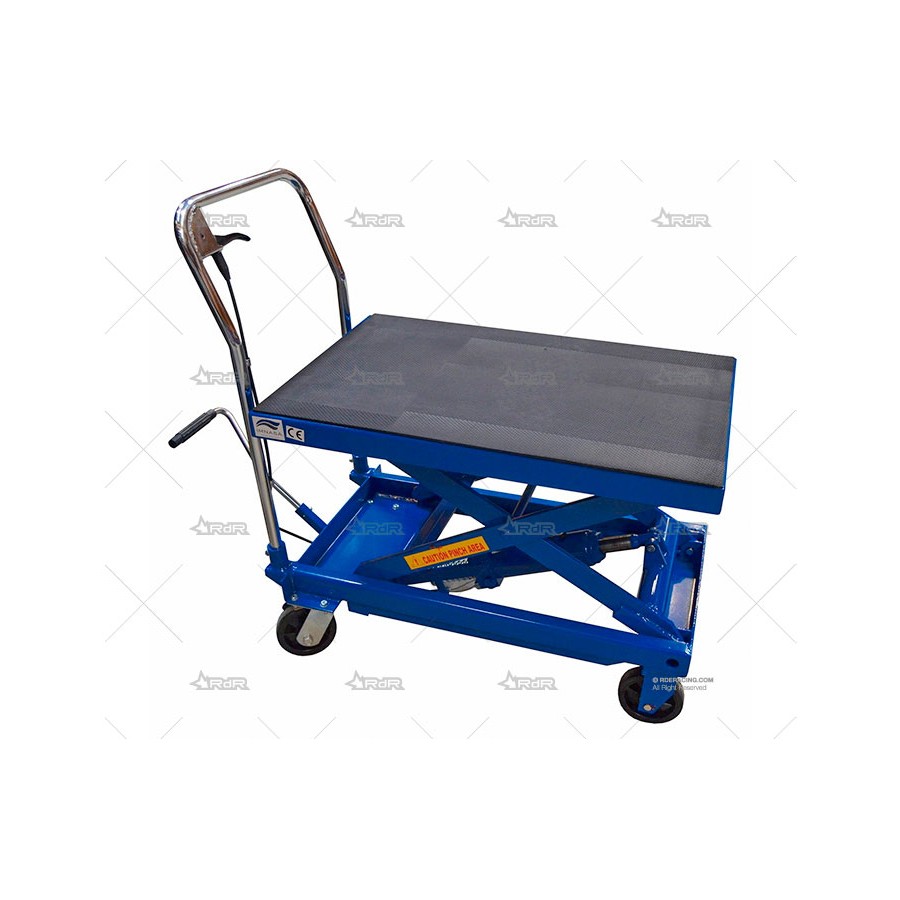 Carrito con mesa elevadora de color azul diseñado para manejar cargas de hasta 500 kg.