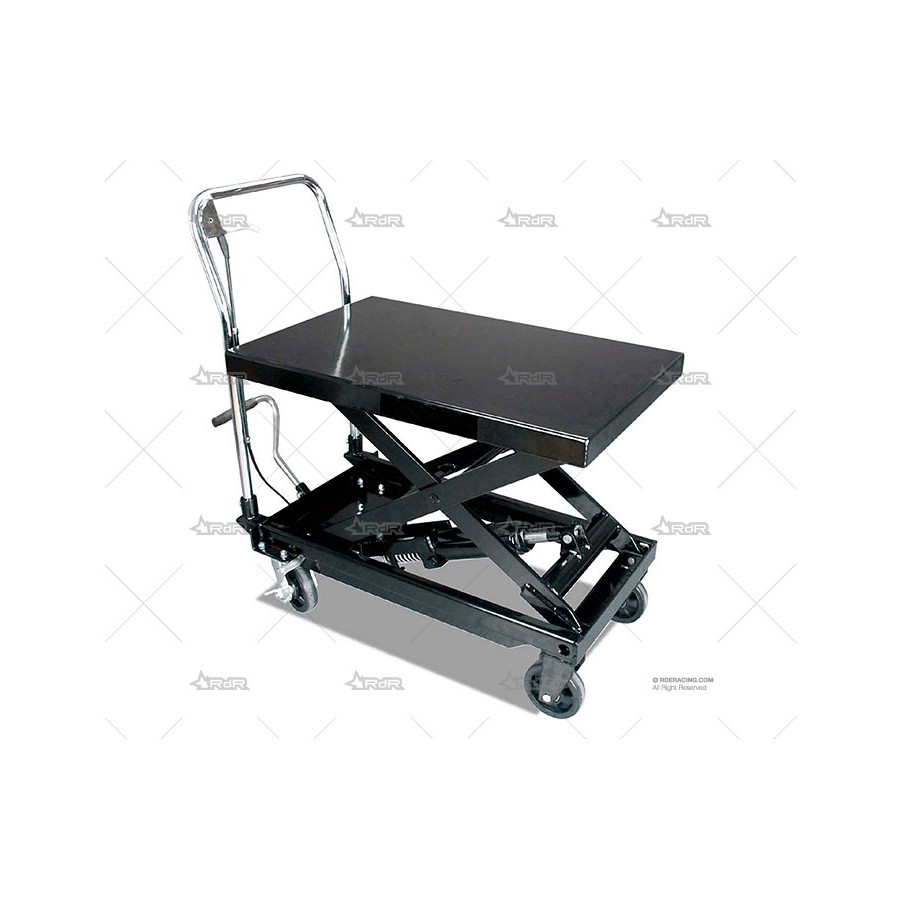 Carrito con mesa elevadora de color negro diseñado para manejar cargas de hasta 150 kg.
