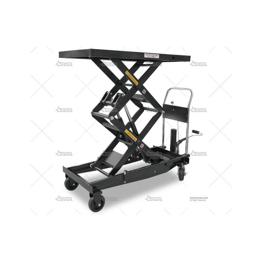 Carrito con mesa elevadora de color negro diseñado para manejar cargas de hasta 1000 kg.