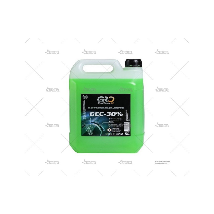 GLOBAL RACING OIL GCC 30% LONG TIME es un líquido refrigerante 100% orgánico, anticongelante, todo tiempo, especialmente formulado para ser empleado en cualquier tipo de circuito de refrigeración, tanto sellados (C.C) como abiertos. La misión fundamental es refrigerar el motor y descender el punto de congelación del agua. GCC-30% LONG TIME tiene una estudiada composición, completamente orgánica en la que intervienen aditivos especiales que tienen como misión, entre otras, la de evitar la formación de depósitos y barros, tanto empleando aguas duras como blandas.