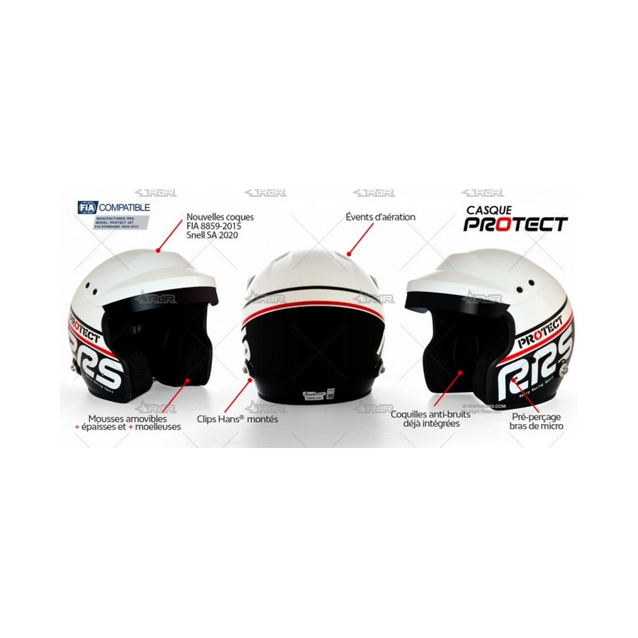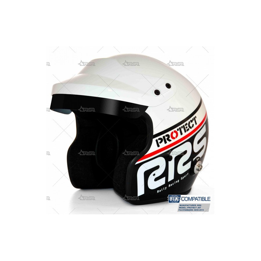 Casco RRS PROTECT JET OF-S1 BLANCO/NEGRO, diseñado para la competición bajo normativa FIA 8859-2015. Fabricado con estructura de fibra de vidrio y dotado de coquillas anti-ruido como en los cascos de gama media-alta. Casco ideal para debutantes en modalidades de competición o bien como casco con gran relación precio-prestaciones. HOMOLOGADO FIA 8859-2015.  Disponibles también en gris mate, negro mate y blanco. Opción de con o sin interfonos. ATENCIÓN: la opción con interfonos NO vienen montados en el casco, se entregarán a parte, fácil instalación. Interfonos compatibles con centralitas stilo WRC/DG10.