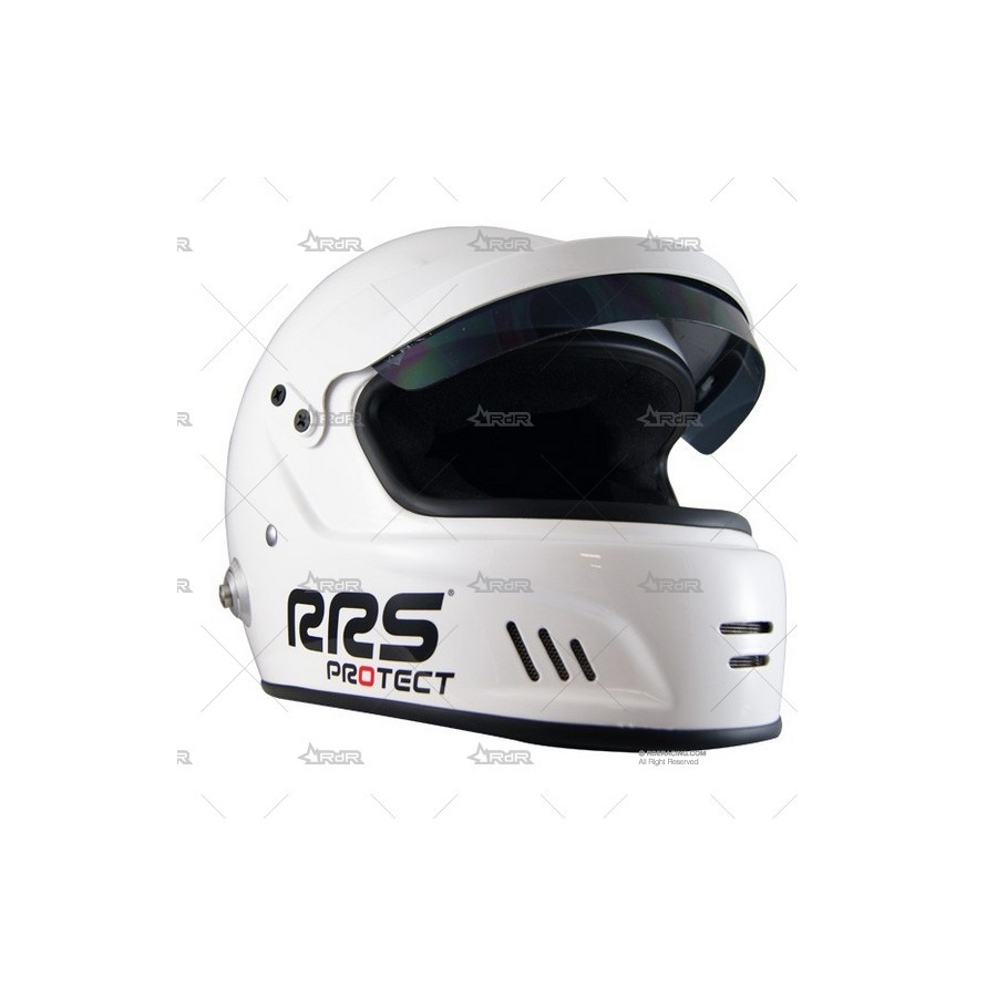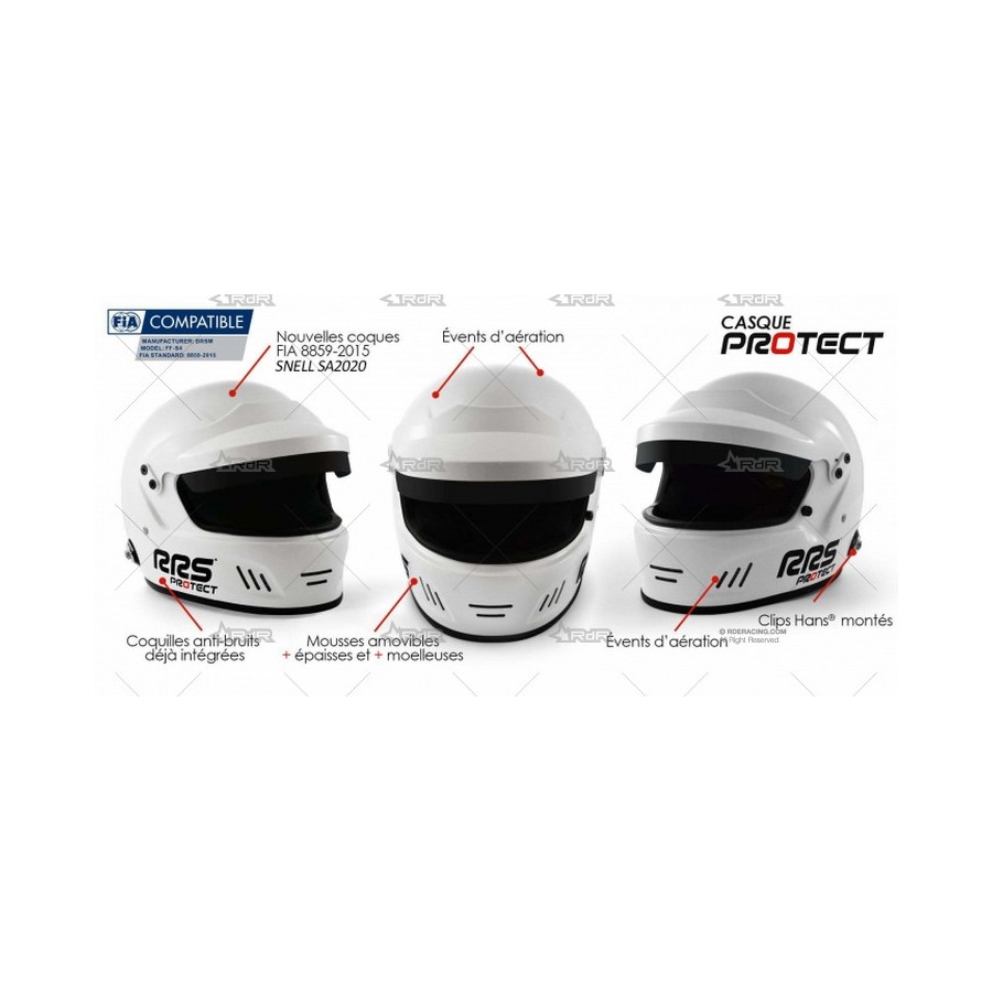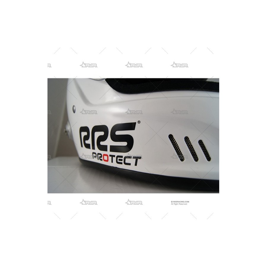 Casco RRS PROTECT INTEGRAL, diseñado para la competición bajo normativa FIA 8859-2015. Fabricado con estructura de fibra de vidrio y dotado de coquillas anti-ruido como en los cascos de gama media-alta. Casco ideal para debutantes en modalidades de competición o bien como casco con gran relación precio-prestaciones. HOMOLOGADO FIA 8859-2015.  Disponibles también en combinación blanco/negro/rojo. Opción de con o sin interfonos. ATENCIÓN: la opción con interfonos NO vienen montados en el casco, se entregarán a parte, fácil instalación. Interfonos compatibles con centralitas stilo.