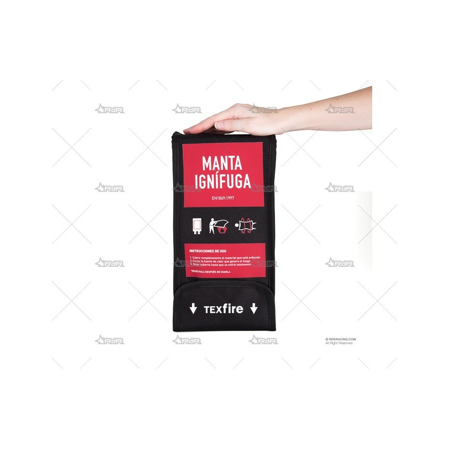 Una manta ignífuga Marina Racewear de 120x120cm es un equipo de seguridad diseñado para sofocar pequeños incendios.Está fabricada con un material altamente resistente al fuego, como la fibra de vidrio. Su función principal es extinguir un incendio al colocarla sobre las llamas, cortando el suministro de oxígeno.