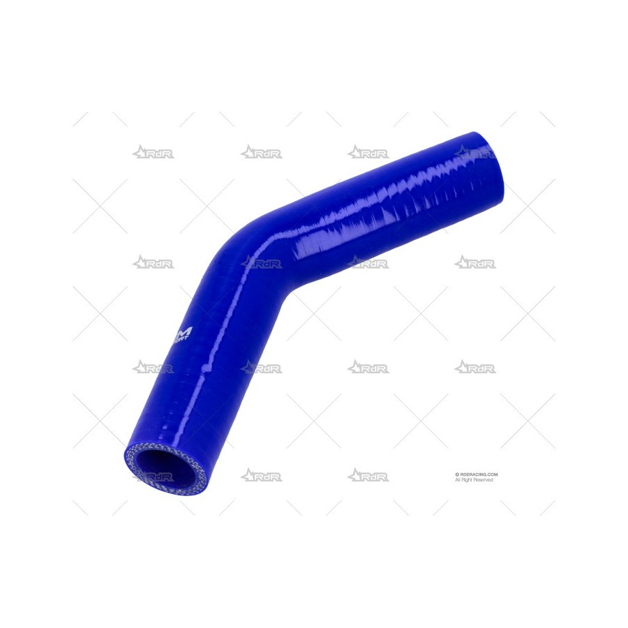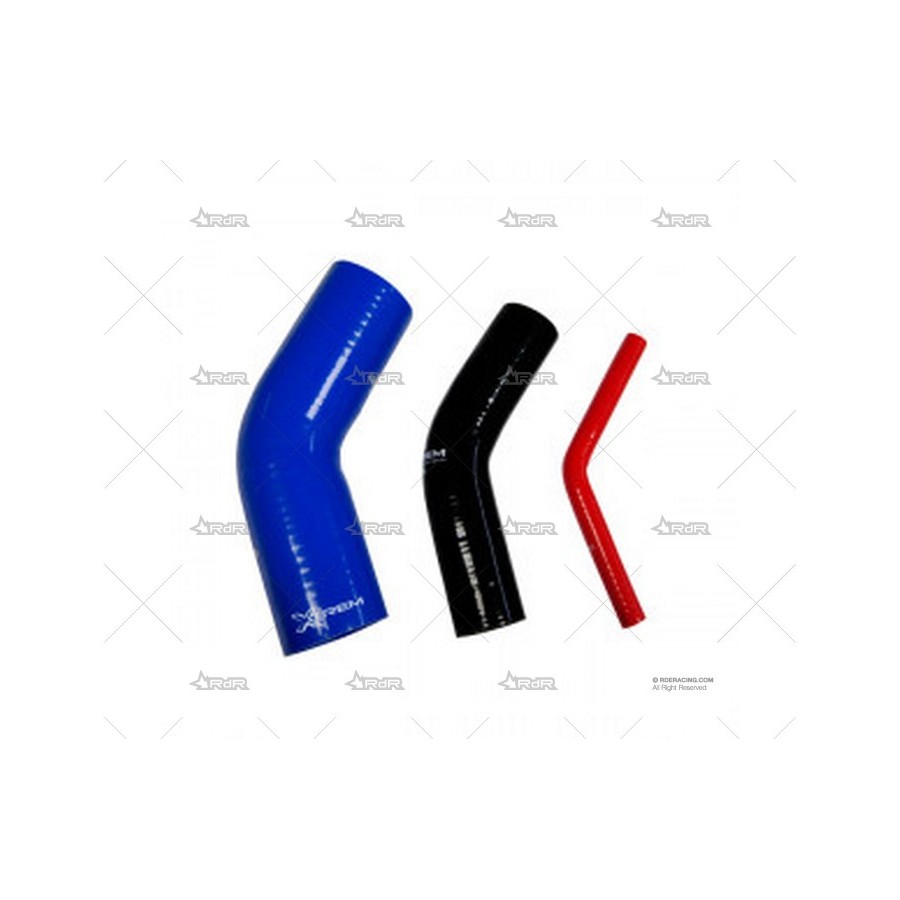 Codo 45º de silicona XTREM para uniones con el mismo diámetro pero con ángulos entre ellas de 45º. Fabricado con silicona de alta calidad reforzado con 4 capas textiles. La longitud es de 100mm desde centro de curvatura hasta extremos (100x100mm). La longitud de 100mm no hace referencia a la parte plana. Vendidos a unidades.