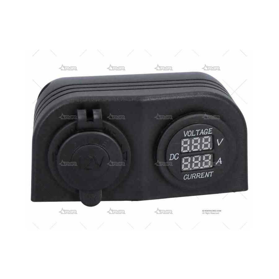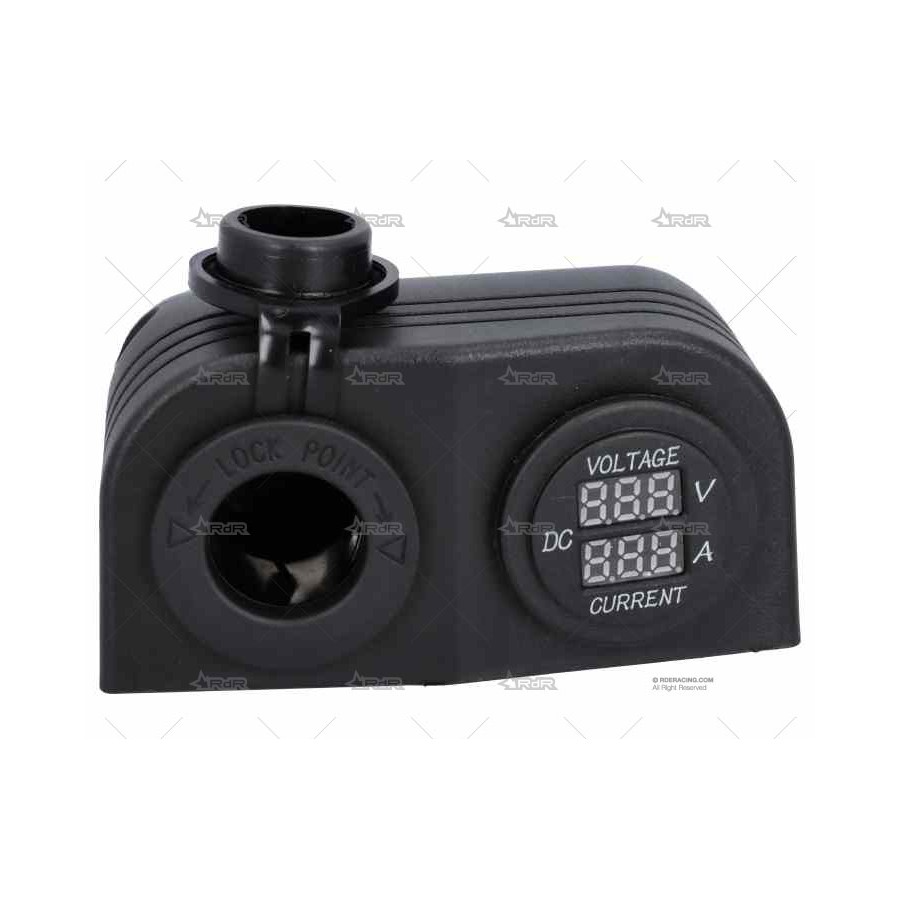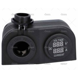 Compuesto de una toma de mechero con tapa de protección, para alimentar cualquier dispositivo externo y otra con voltímetro y amperímetro, útil para controlar la carga y el rendimiento de la instalación de baterías del barco.