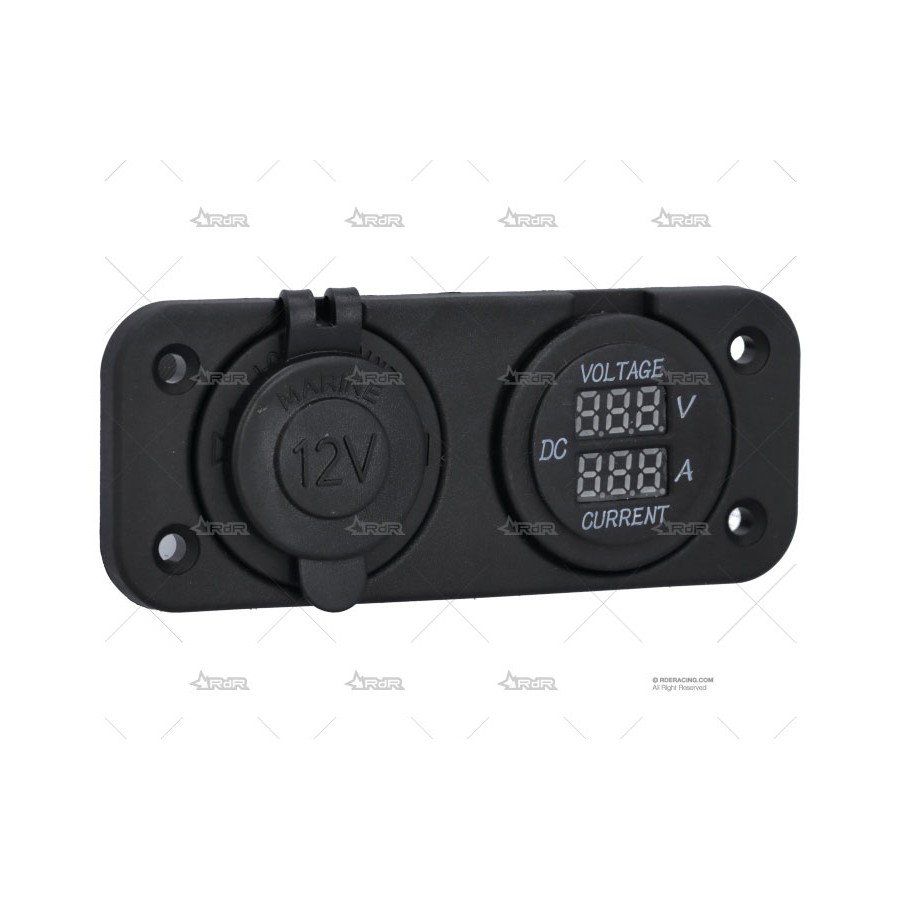 Compuesto de una toma de mechero con tapa de protección, para alimentar cualquier dispositivo externo y otra con voltímetro y amperímetro, útil para controlar la carga y rendimiento de la instalación de baterías del barco.